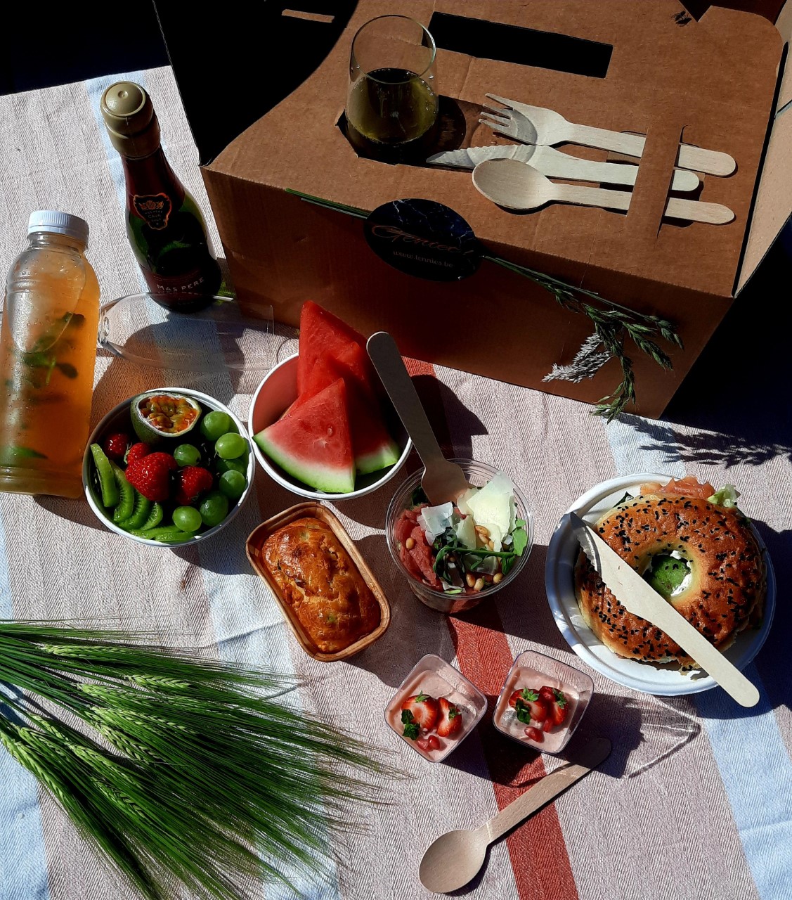 Italiaanse pastasalade, Wrap met gerookte zalm, kruidenkaas en komkommer, Bagel met kip, Homemade limonades, Flesje bubbels (20 cl), Verse fruitsla, 2 Cheesecakejes